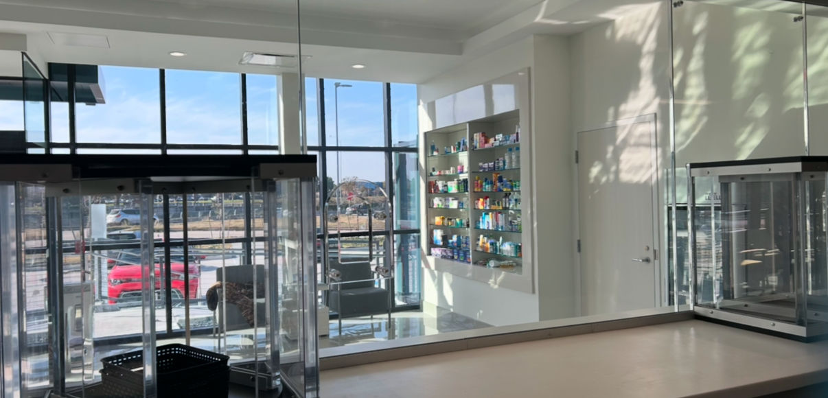 Southwest Glass completed an important upgrade for Health Co Pharmacy, enhancing both safety and functionality. Our team recaulked the exterior of the building to ensure long-lasting protection and efficiency. Inside the service area, we replaced and upgraded the Level 3 bullet-resistant glass, providing added security for staff and customers. In addition, we designed and installed a custom kiosk enclosure for the pill dispenser, improving convenience while maintaining a clean, professional look.